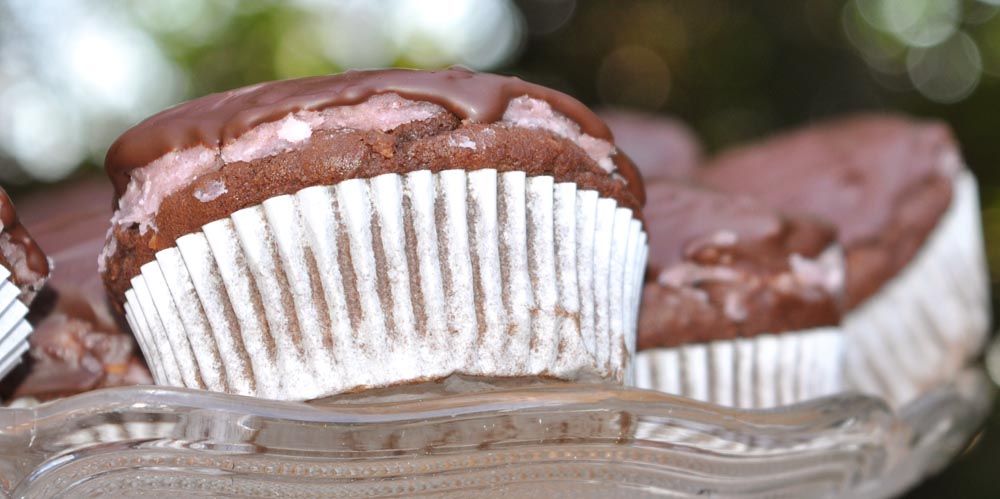 Light, fluffy chocolate cupcakes with a hint of raspberry and a dash of coconut, topped with a divine coconut raspberry frosting and drizzled with smooth dark chocolate – cupcake heaven!