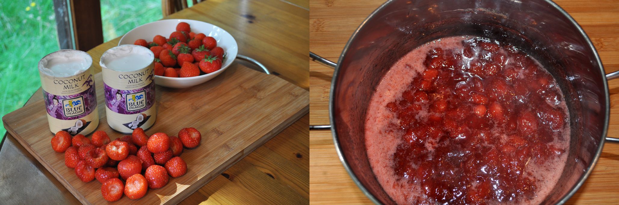 Simply Scrumptious Strawberry Ice Cream Prep Time: 25 mins Freeze Time: 24-28 hrs Makes 12 -14 Scoops Ingredients: 800ml (31/2 Cups) Coconut Milk – 2 Cans 700g (about 4 cups) Strawberries – Divided into 2 2 Tsps Arrowroot Powder 1 Cup Agave Nectar – Divided into 3 separate 1/3 cups 1 Tsp Xanthan Gum Instructions 1) In a saucepan add 1/3 cup of Agave Nectar to 1 3/4 Cups (1 can) of coconut milk and place over a medium/high flame for about 10 mins. Be careful not to take your eye off it, coconut milk can boil over in a blink so make sure to whisk periodically to prevent this happening. 2) Add 2 tsps of Arrowroot Powder and whisk thoroughly. Simmer on a medium/low heat for a further 5 mins stirring constantly. The mix will start to thicken – remove from heat. 3 ) Alongside chop and hull half of the strawberries and simmer on a medium/low heat with 1/3 cup of agave nectar. Make sure to stir from time to time to prevent the mix sticking and burning. After about 10-12 mins the mix will thicken into a strawberry sauce. Remove from heat. 4) Blend the remaining strawberries with 1/3 cup of agave nectar until smooth. 5) Add all the ingredients together in the blender and blend until smooth. Optional: you can hold back 1/3 cup of cooked strawberries to stir in later. 6) Place in a dish (I use a bread loaf tin) and allow the Ice Cream mix to cool thoroughly. I don’t have an ice cream maker so here is what I do to create really smooth creamy ice cream. Once the mix has cooled thoroughly place in the freezer overnight. The next day, once the ice cream is frozen completely, remove from the container and chop into pieces. Place into a blender and blend until smooth. The mix should be a bit like soft whip ice cream when you’re finished. If you held back 1/3 Cup of strawberries you can mix them in now. The more solid ice cream will hold them in place. Place back in the freezer for 2 -4 hours before serving. 7) Serve and enjoy! J